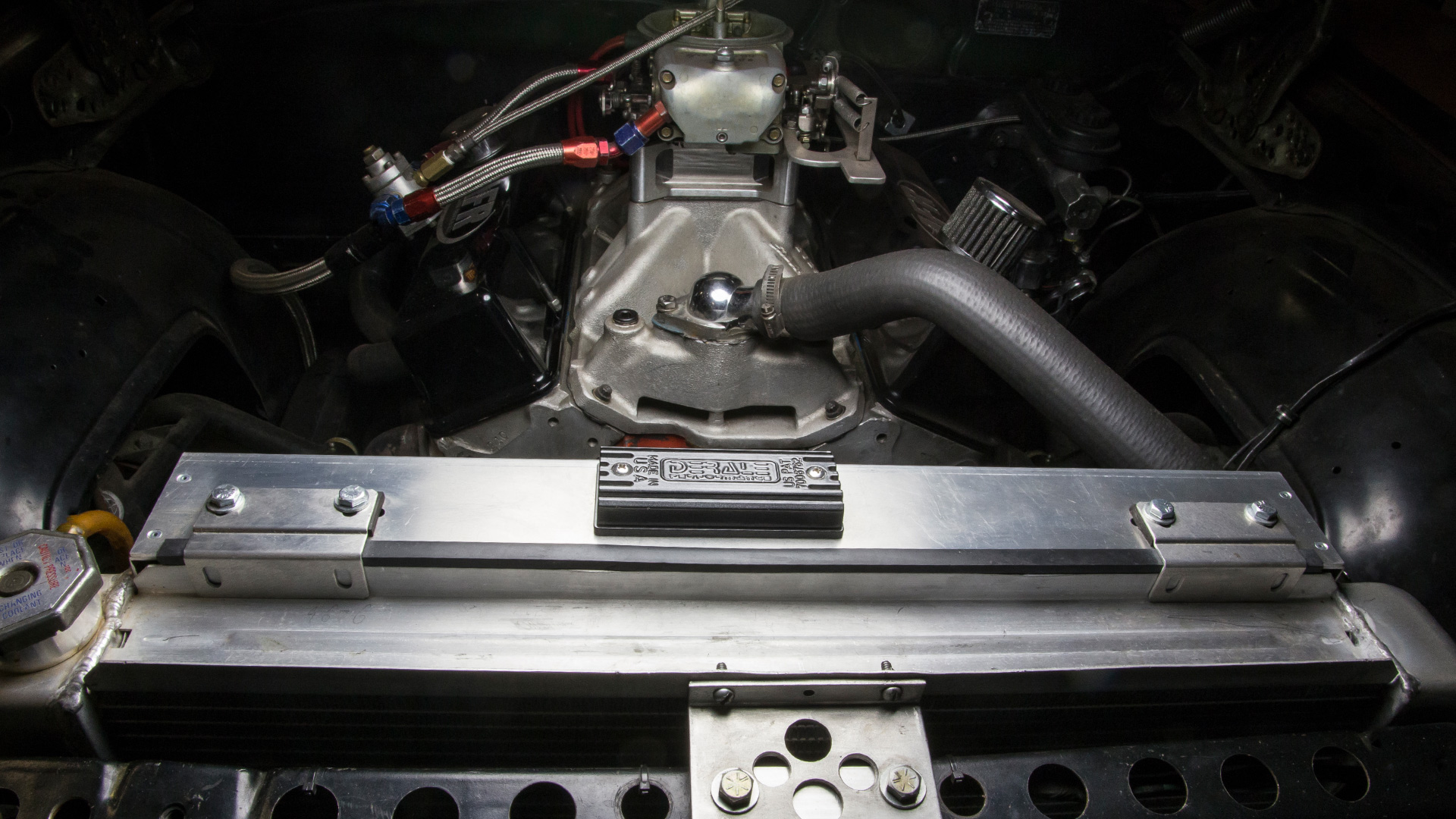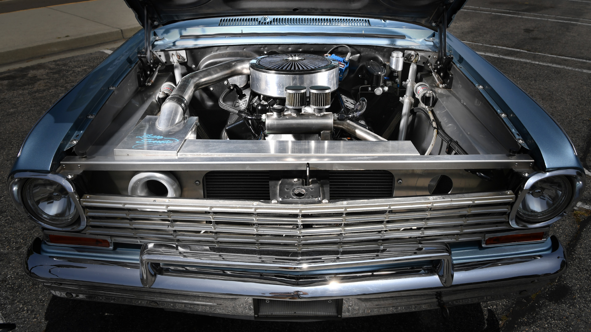 Evan Dalley knows how to keep it cool! This 1963 Chevy Nova keeps it cool during autocross events using the Derale PWM Controller (16795) and a Derale dual shrouded electric fan set up (16837). It has a 427” SBC built by Caldwell Performance running 11.3:1 compression, a Scat rotating assembly with a Dart Iron Eagle block, Caldwell Performance built headers, Magnaflow mufflers, MSD Ignition, Muncie M20 Transmission. To cool the transmission a Derale 25 row Stack Plate cooler (52506) is also installed. this is one Bad Nova!!!!
