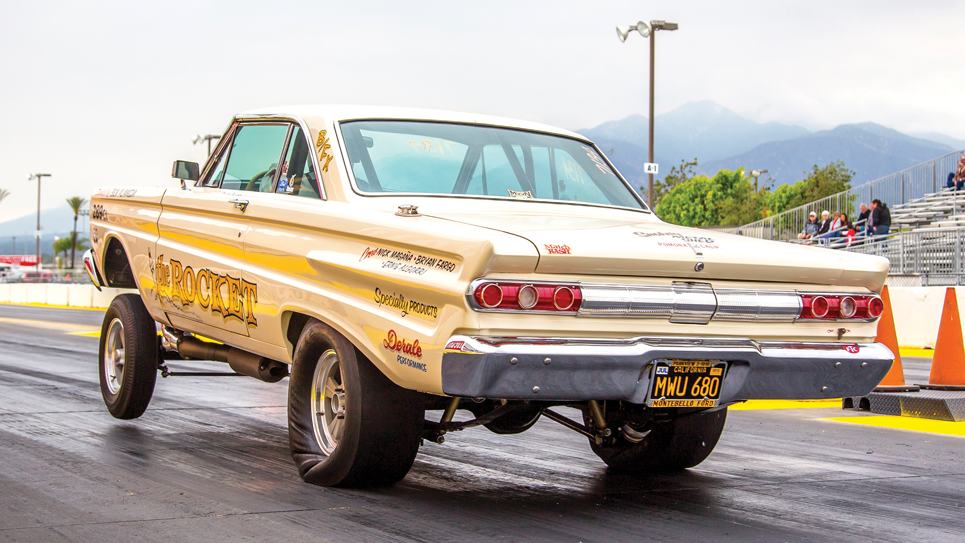Glendora CA-based Dale Snoke's 1964 Mercury Comet "The Rocket" has literally circled the globe. The car was featured at the MOONEYES Japan show, as well as the car show in the UK and back to the USA. The Fast details include a 351 Windsor bored to 425 c.i.d. with Ford 3-speed automatic. The build also features a Derale 25 Row Series 10000 Stack Plate Cooler, a heavy-duty Derale flex fan with a 2” spacer and a custom-built fan shroud. A Holley Performance Products Intake, MSD Performance Ignition, Custom Headers, Dual Flowmaster Mufflers INC., 9” Ford Rear Axle, Speedway Motors 48" front axles at the corners 15x4.5, 15x7 Rocket Racing Wheels Strike As Cast wrapped in Coker Tire 640-15, 1000-15 Vintage Firestone.