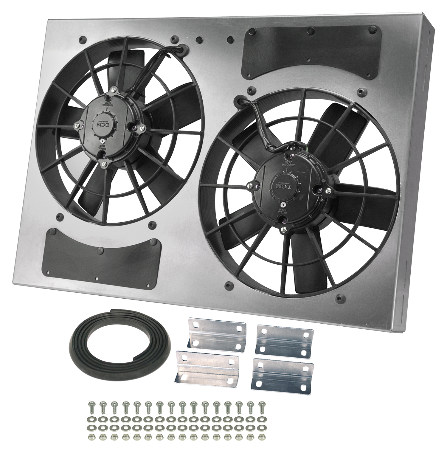 This Dual High Output RAD Fan Powerpack Assembly allows true Dual Fan performance in a package the size of other Single shrouded fans. Featuring an aluminum shroud measuring a tidy 24" wide by 17" top to bottom and only 4 1/2" in overall depth to offer an adjustable yet precision fit, it uses two IP-68 certified waterproof/dustproof 11" electric fans to provide a powerful one-two 3750 cfm punch to a hot engine. The natural, non-finished aluminum shroud gives the user the freedom to polish, anodize, paint, or simply leave it raw to create a truly custom look at a reasonable price.