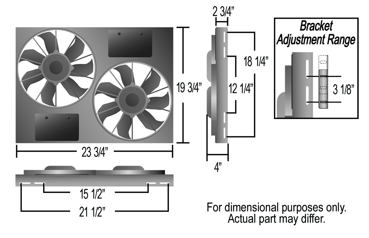 This Dual High Output RAD Fan Powerpack Assembly allows true Dual Fan performance in a package the size of others Single shrouded fans. Featuring an aluminum shroud measuring a tidy 23 3/4" wide by 19 3/4" top to bottom and only 4 1/2" in overall depth to offer an adjustable yet precision fit, it uses two IP-68 certified waterproof/dustproof 11" electric fans to provide a powerful one-two 3750 cfm punch to a hot engine. The natural, non-finished aluminum shroud gives the user the freedom to polish, anodize, paint, or simply leave it raw to create a truly custom look at a reasonable price.