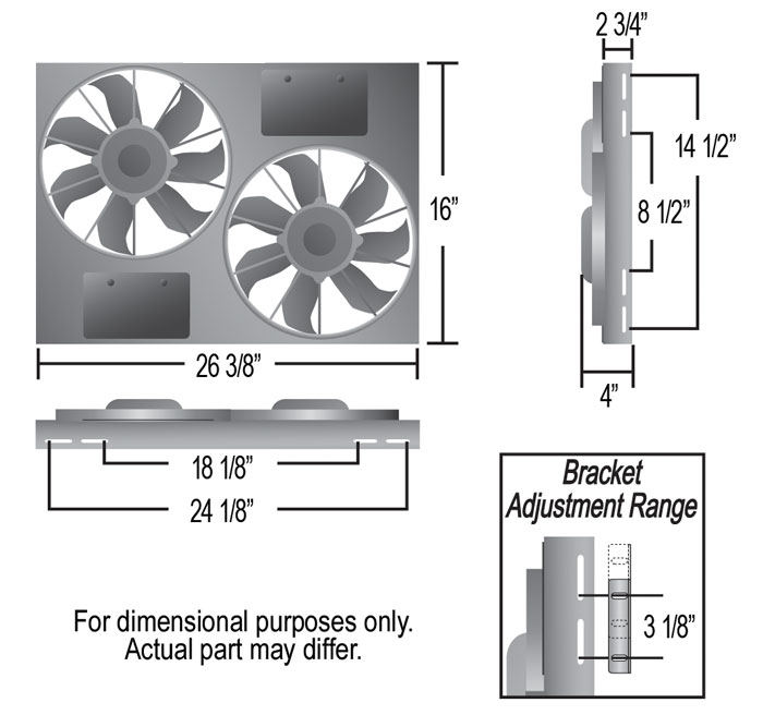 This Dual High Output RAD Fan Powerpack Assembly is part of the HO Aluminum Shrouded Fan Series that is designed with the application in mind. Based on some of the most common radiator core sizes sold today, this unit features an aluminum shroud measuring 26 3/8" wide by 16" top to bottom and is only 4" in overall depth to offer an adjustable yet precision fit. The natural, non-finished aluminum shroud gives the user the freedom to polish, anodize, paint, or simply leave it raw to create a truly custom look for an affordable price. The dual 12" high output electric fans are some of the most proven and reliable fans in our line-up. Offering a total of 4000 CFM, this dual electric fan assembly generates the most real-world airflow in the smallest package on the market.