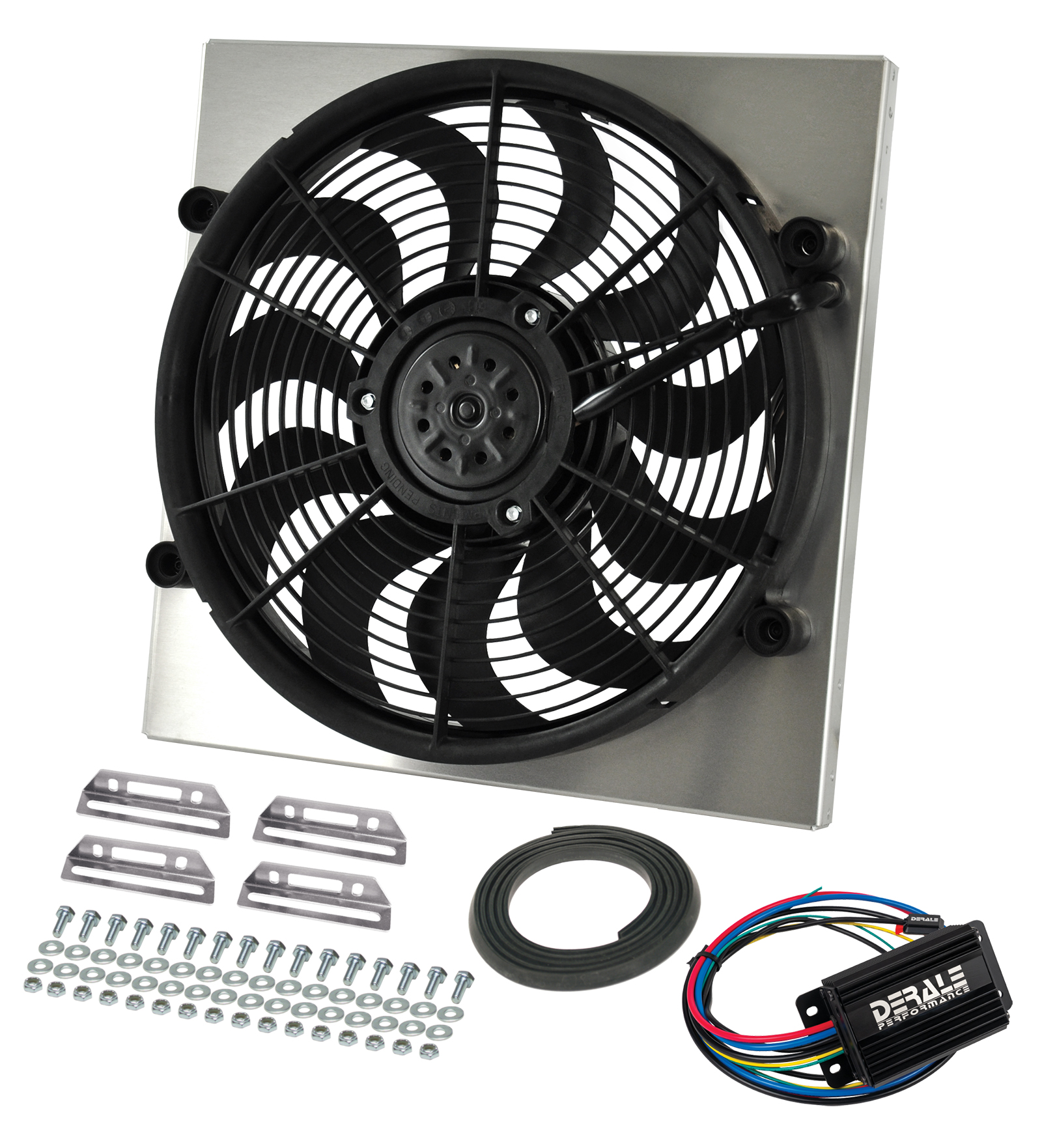 Get complete control of your engine temperature! Derale Performance has combined their high-performing shrouded powerpacks with the ultimate fan controller. Using a high output electric fan incorporated into an engineered shroud, this powerpack can conquer even the most difficult cooling conditions. This unit features an Aluminum shroud measuring 18" wide by 18" top to bottom and is only 3" in overall depth to offer a precision fit. This 17" high output two-speed fan is one of the best in our line-up offering up to 2400 CFM and is specifically designed to thrive on thick, tight fin radiator cores.