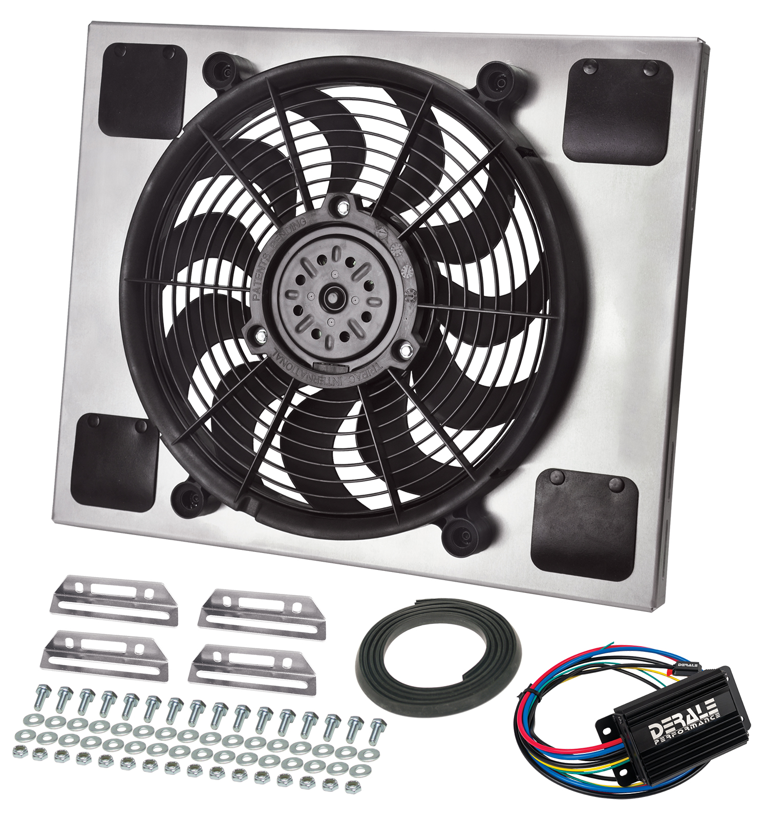 Get complete control of your engine temperature! Derale Performance has combined their high-performing shrouded powerpacks with the ultimate fan controller. Using a high output electric fan incorporated into an engineered shroud, this powerpack can conquer even the most difficult cooling conditions. This unit features an Aluminum shroud measuring 20" wide by 16-3/8" top to bottom and is only 2-3/4" in overall depth to offer a precision fit. This 14" high output two-speed fan is one of the best in our line-up offering up to 2100 CFM and is specifically designed to thrive on thick, tight fin radiator cores.