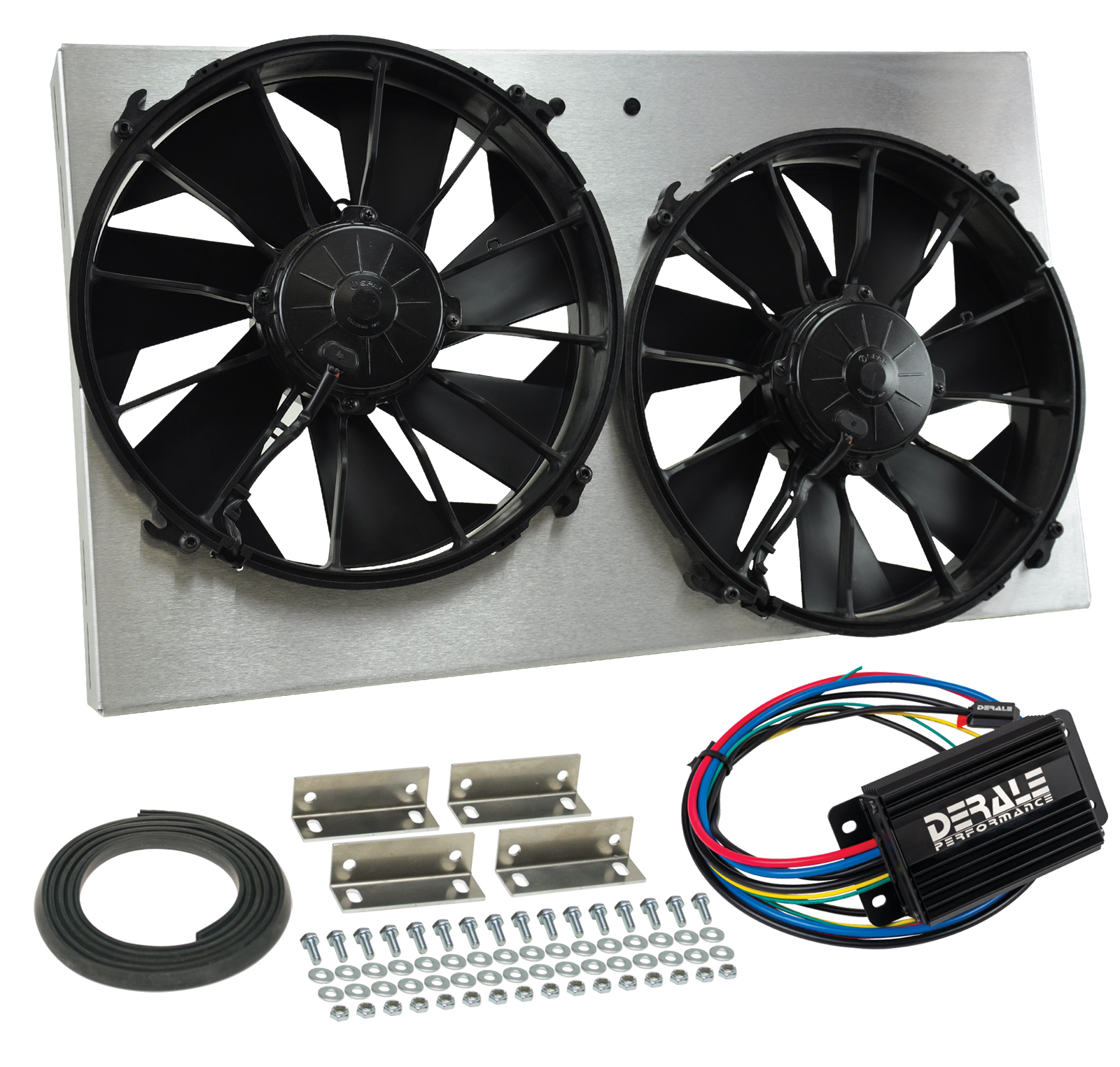 Get complete control of your engine temperature! Derale Performance has combined their high-performing shrouded Powerpacks with the ultimate fan controller. Using high output electric fans incorporated into an engineered shroud, this Powerpack can conquer even the most difficult cooling conditions. This unit features an aluminum shroud measuring 25 5/8" wide by 15 1/8" top to bottom and is only 4" in overall depth to offer an adjustable yet precision fit. The natural, non-finished aluminum shroud gives the user the freedom to polish, anodize, paint, or simply leave it raw to create a truly custom look for an affordable price. The dual 12" high output electric fans are some of the most proven and reliable fans in our line-up and are specifically designed to thrive on thick, tight fin radiator cores. Offering a total of 4000 CFM, this dual electric fan assembly generates the most real-world airflow in the smallest package on the market.