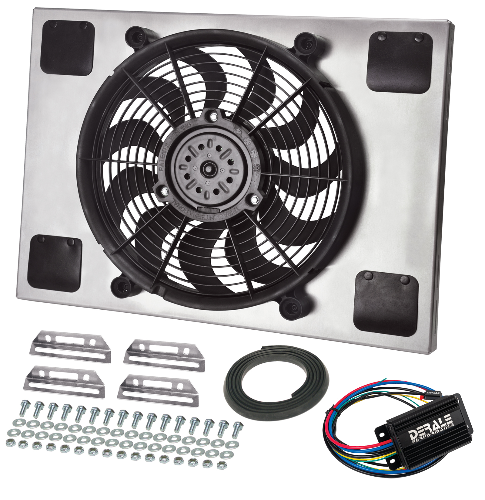 Get complete control of your engine temperature! Derale Performance has combined their high-performing shrouded powerpacks with the ultimate fan controller. Using a high output electric fan incorporated into an engineered shroud, this powerpack can conquer even the most difficult cooling conditions. This unit features an Aluminum shroud measuring 23-7/16" wide by 15-7/16" top to bottom and is only 2-3/4" in overall depth to offer a precision fit. This 14" high output two-speed fan is one of the best in our line-up offering up to 2100 CFM and is specifically designed to thrive on thick, tight fin radiator cores.