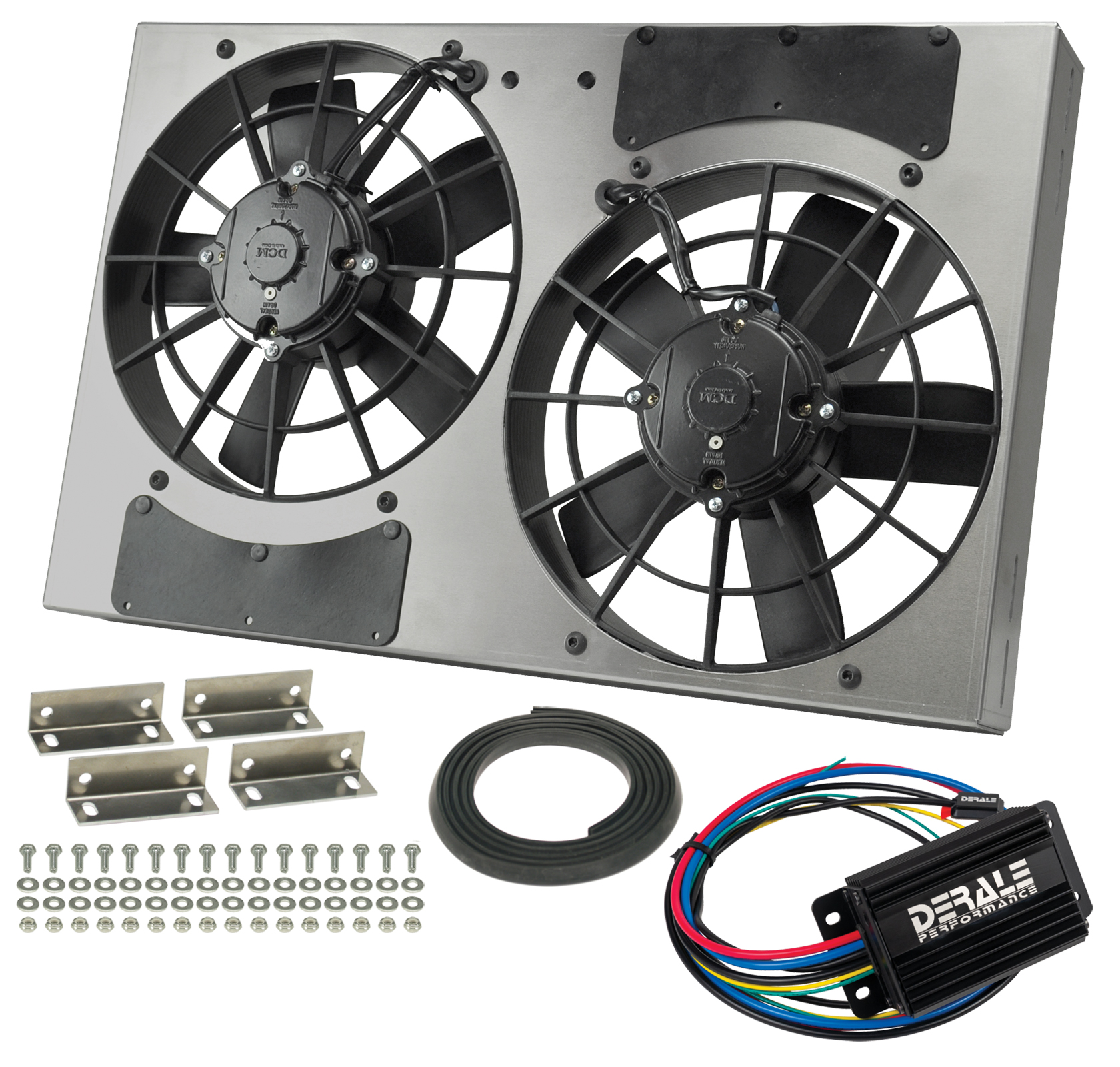 Get complete control of your engine temperature! Derale Performance has combined their high-performing shrouded Powerpacks with the ultimate fan controller. Using high output electric fans incorporated into an engineered shroud, this Powerpack can conquer even the most difficult cooling conditions. This unit features an aluminum shroud measuring 24" wide by 15 1/2" top to bottom and is only 4" in overall depth to offer an adjustable yet precision fit. The natural, non-finished aluminum shroud gives the user the freedom to polish, anodize, paint, or simply leave it raw to create a truly custom look for an affordable price. The Dual IP-68 certified waterproof/dustproof 11" electric fans provide a powerful one-two 3750 cfm punch to a hot engine. This dual electric fan assembly generates the most real-world airflow in the smallest package on the market.