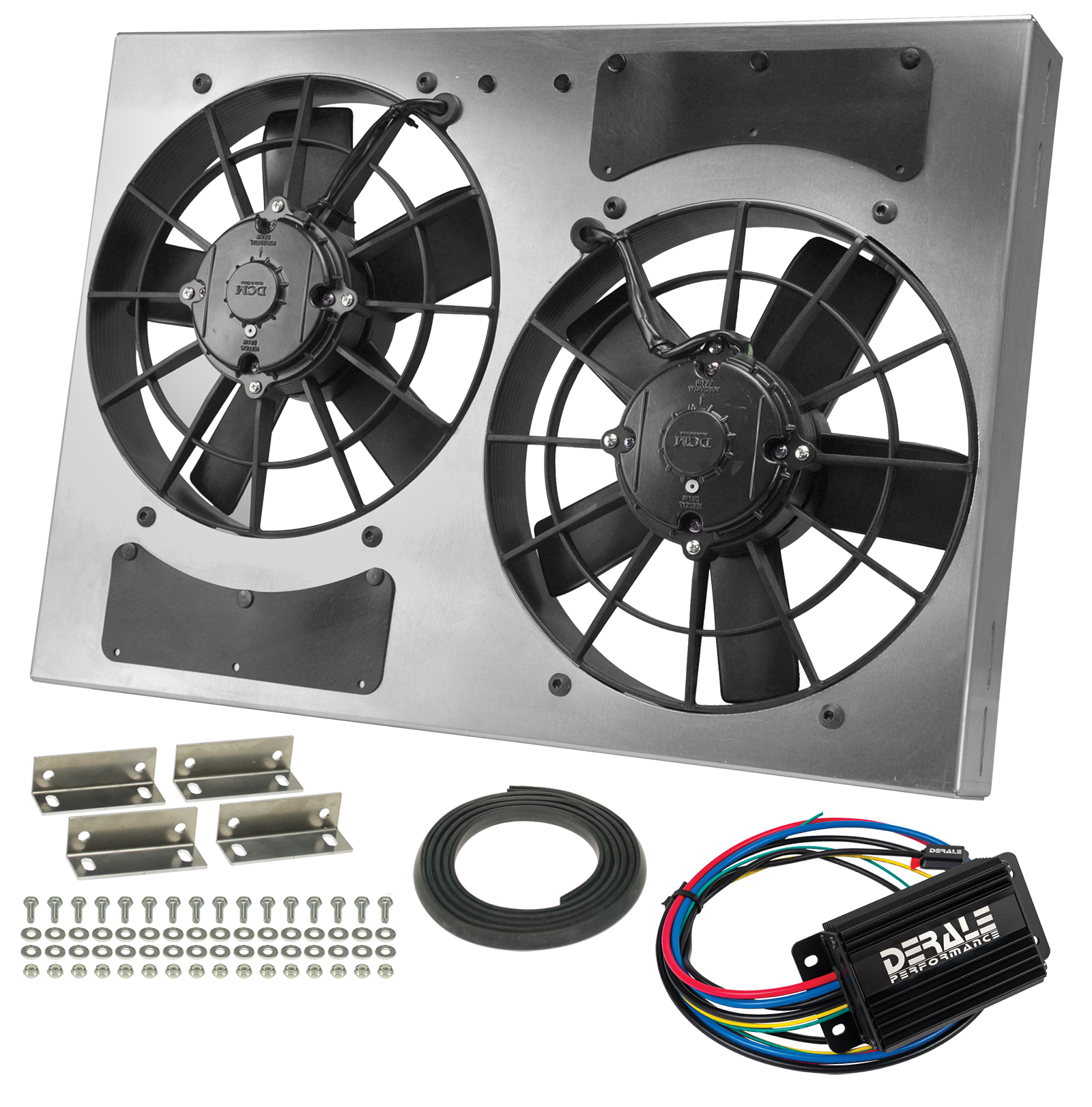 Get complete control of your engine temperature! Derale Performance has combined their high-performing shrouded powerpacks with the ultimate fan controller. Using high output electric fans incorporated into an engineered shroud, this powerpack can conquer even the most difficult cooling conditions. This unit features an aluminum shroud measuring 24" wide by 17" top to bottom and is only 4" in overall depth to offer an adjustable yet precision fit. The natural, non-finished aluminum shroud gives the user the freedom to polish, anodize, paint, or simply leave it raw to create a truly custom look for an affordable price. The Dual IP-68 certified waterproof/dustproof 11" electric fans provide a powerful one-two 3750 cfm punch to a hot engine. This dual electric fan assembly generates the most real-world airflow in the smallest package on the market.
