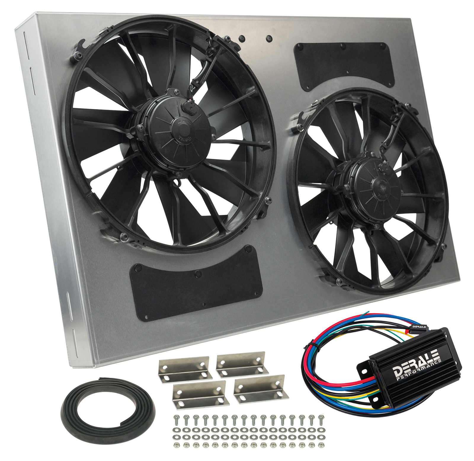 Get complete control of your engine temperature! Derale Performance has combined their high-performing shrouded powerpacks with the ultimate fan controller. Using high output electric fans incorporated into an engineered shroud, this powerpack can conquer even the most difficult cooling conditions. This unit features an aluminum shroud measuring 27" wide by 18" top to bottom and is only 4" in overall depth to offer an adjustable yet precision fit. The natural, non-finished aluminum shroud gives the user the freedom to polish, anodize, paint, or simply leave it raw to create a truly custom look for an affordable price. The dual 12" high output electric fans are some of the most proven and reliable fans in our line-up and are specifically designed to thrive on thick, tight fin radiator cores. Offering a total of 4000 CFM, this dual electric fan assembly generates the most real-world airflow in the smallest package on the market.