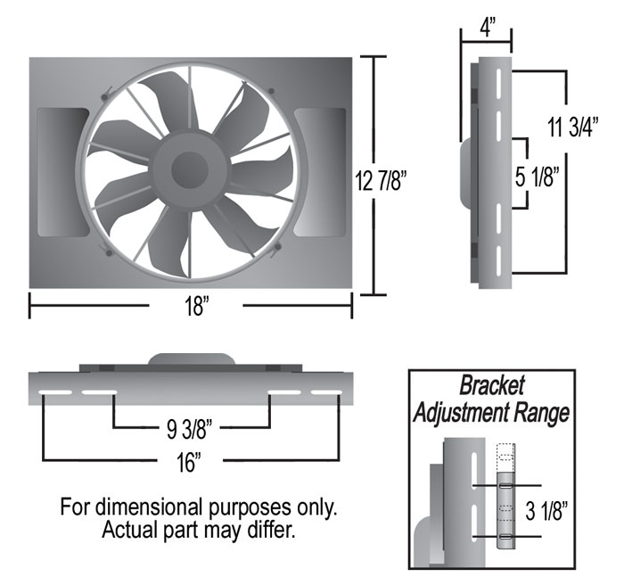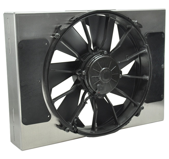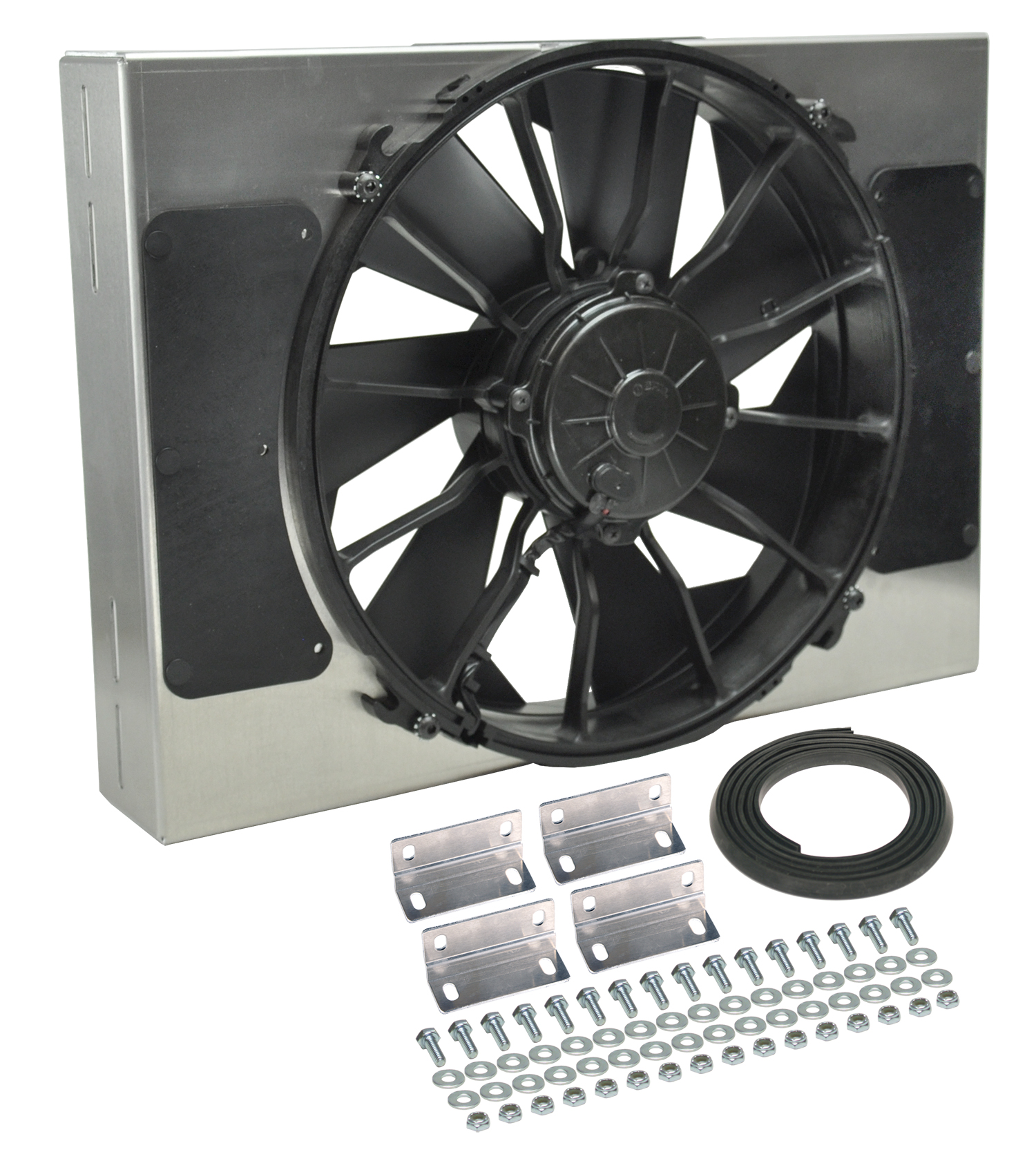 This High Output Single RAD Fan Powerpack is part of the HO Aluminum Shrouded Fan Series designed with popular applications in mind. This assembly measures 18" wide by 13" top to bottom and only 4" thick overall to offer an adjustable yet precision fit. The raw aluminum shroud gives the user the freedom to polish, anodize, paint, or simply leave it natural to create a truly custom look for an affordable price. Using a 12" high output fan offering 2000 CFM to create the most airflow possible in a compact size. Shroud comes equipped with two air pressure relief vents.