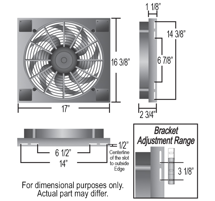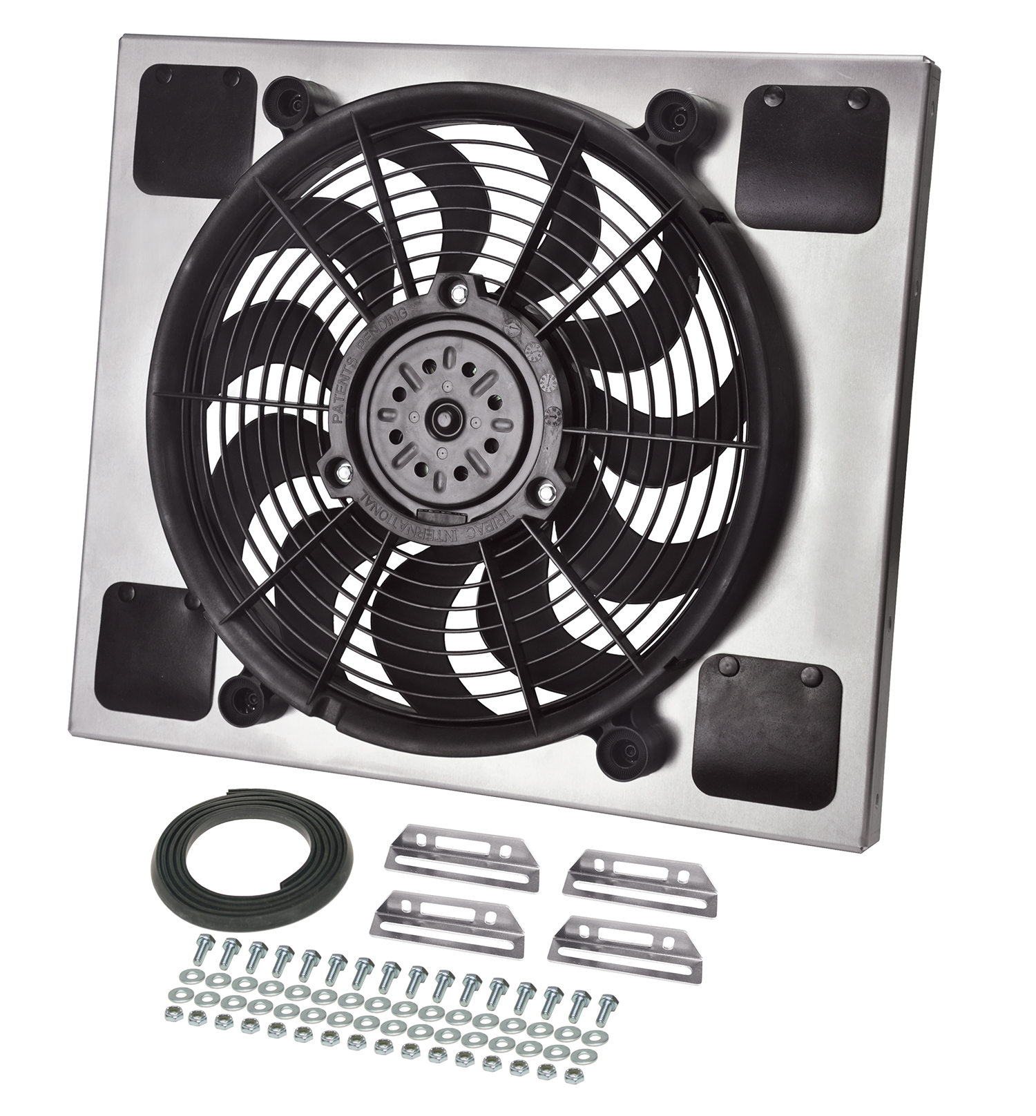 This High Output Single RAD Fan Powerpack is part of the HO Aluminum Shrouded Fan Series designed with popular applications in mind. This assembly measures 17" wide by 16 3/8" top to bottom and only 2 3/4" thick to offer an adjustable yet precision fit. The raw aluminum shroud gives the user the freedom to polish, anodize, paint, or simply leave it natural to create a truly custom look for an affordable price. The 14" high output two speed fan is one of the best in our line-up offering 2100 CFM when on high to create the most airflow possible in a compact size.