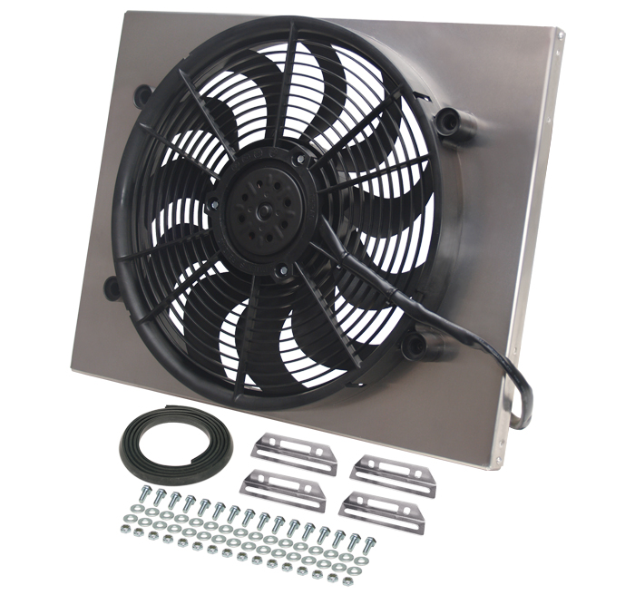 This High Output Single RAD Fan Powerpack is part of the HO Aluminum Shrouded Fan Series designed with popular applications in mind. This assembly measures 22 1/4" wide by 17 5/8" top to bottom and only 3" thick overall to offer a precision fit. The raw aluminum shroud gives the user the freedom to polish, anodize, paint, or simply leave it natural to create a truly custom look for an affordable price. The 17" high output two-speed fan is one of the best in our line-up offering 2400 CFM when on high to create the most airflow possible in a compact size.