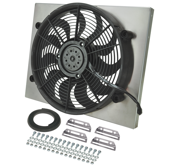 This High Output Single RAD Fan Powerpack is part of the new HO Aluminum Shrouded Fan Series designed with popular applications in mind. This assembly measures 21" wide by 16 3/4" top to bottom and only 3" thick overall to offer a precision fit. The raw aluminum shroud gives the user the freedom to polish, anodize, paint, or simply leave it natural to create a truly custom look for an affordable price. The 17" high output two-speed fan is one of the best in our line-up offering 2400 CFM when on high to create the most airflow possible in a compact size.