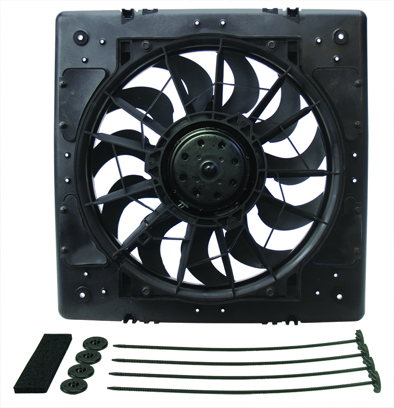 Another popular universal shrouded Single H.O. RAD fan, this puller fan features an injection molded shroud with pressure relief vents, 265 watt Tri-pac motor spinning 11 quiet, patented skewed blades qualifies it for primary cooling use. Kit includes 4 plastic, through-radiator core rods and clips and 4 foam mounting pads.