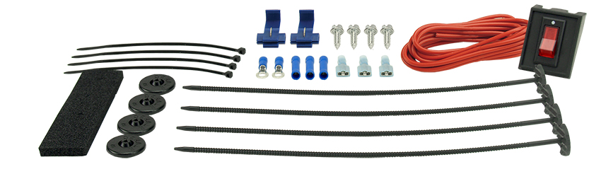 - Kit contains 4 plastic rods with hardware, toggle switch, wire, zip ties, and wire connectors