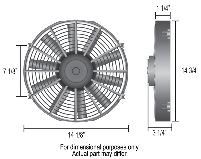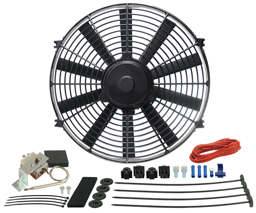 A great auxiliary fan or primary cooling fan for smaller cars and trucks, this 14" straight blade electric fan produces 1100 CFM at 0 static pressure, drawing only 12.4 amps. Kit includes fan, mounting kit and mechanical fan controller with adjustable turn on temp between 32°F-240°F with turn off set at 10°F below turn on. Uses a capillary tube radiator hose probe design.