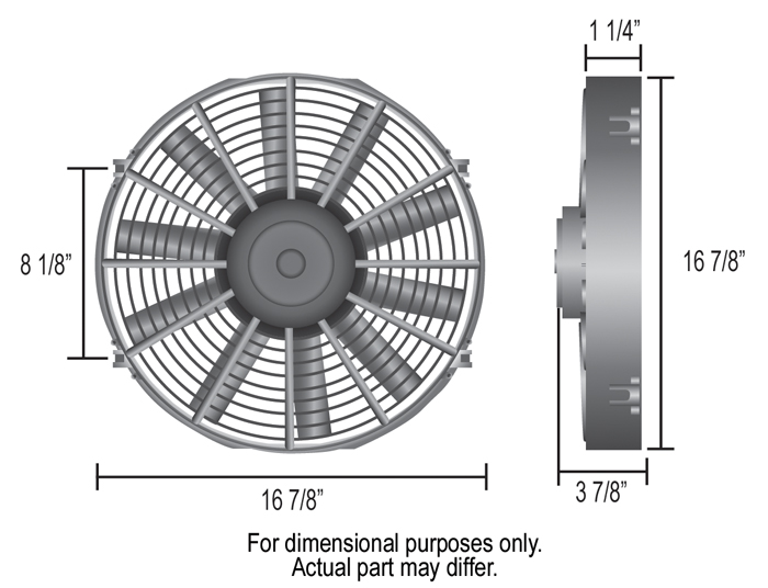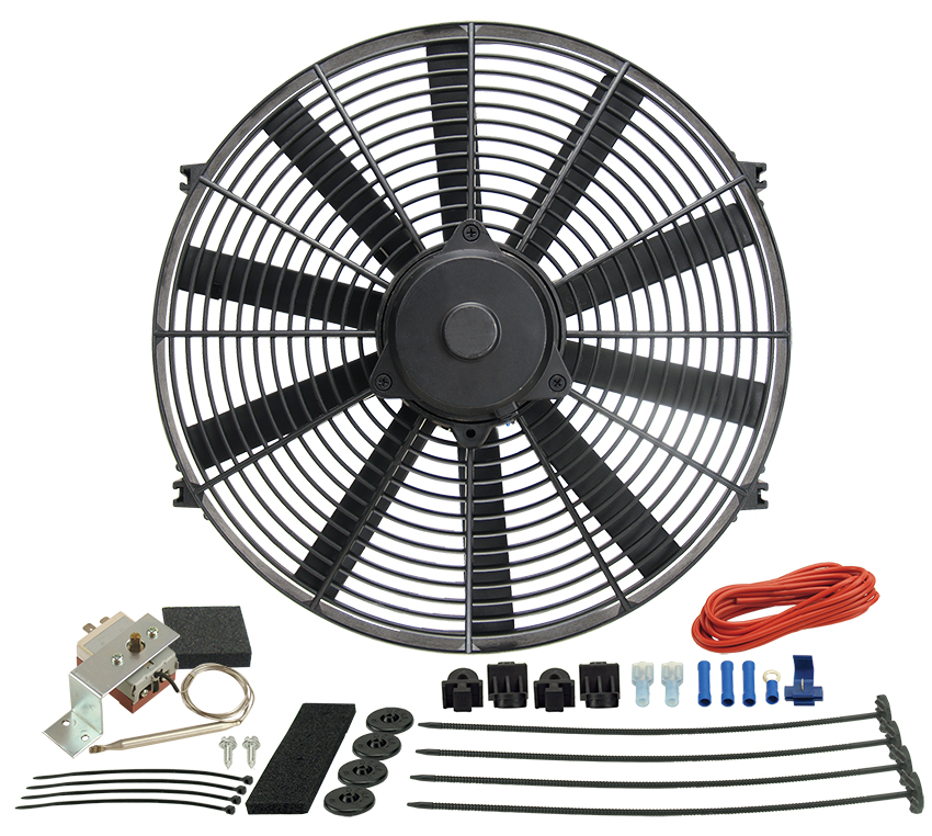 A great auxiliary fan or primary cooling fan for small to intermediate cars and trucks, this 16" straight blade electric fan produces 1550 CFM at 0 static pressure, drawing only 15.5 amps. Includes fan, mounting kit and mechanical fan controller with adjustable turn on temp between 32°F-240°F with turn off set at 10°F below turn on. Uses a capillary tube radiator hose probe design.