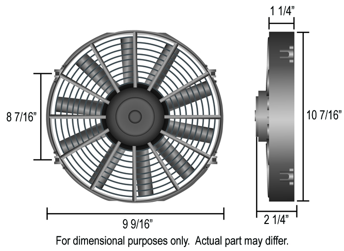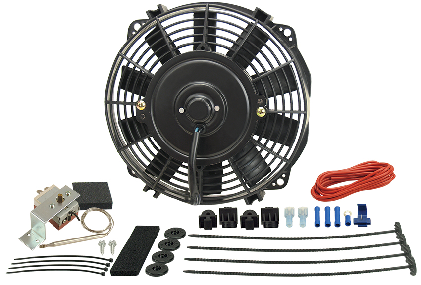 This reliable 9" straight blade electric fan moves 475 CFM at 0 static pressure, drawing only 6.4 amps. Included in kit: fan, mounting kit, mechanical fan controller with adjustable turn on temp between 32°F-240°F with turn off set at 10°F below turn on. Uses a capillary tube radiator hose probe design.