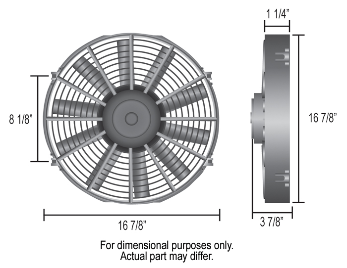 A great auxiliary fan or primary cooling fan for small to intermediate cars and trucks, this 16" straight blade electric fan produces 1550 CFM at 0 static pressure, drawing only 15.5 amps. Included with each fan: mounting kit consisting of 4 plastic, through-radiator core rods and clips, 4 foam pads and 4 mounting feet.