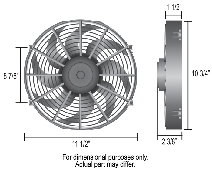 This 10" electric fan uses curved blades to provide more blade area and performance with less noise, plus has a lower profile. It moves 590 CFM at 0 static pressure, drawing only 5.3 amps. Included with each fan is a fan mounting kit with 4 plastic through radiator core rods and clips, 4 foam pads and 4 mounting feet.