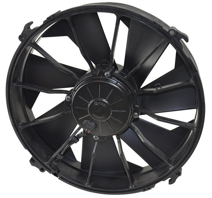 This 12" High Output Single RAD fan is a self-shrouded, symmetrical design with four molded mounting points. Motivated by a 300 watt motor driving 7 skewed blades, it can be used as a pusher with the supplied hardware kit. Fan can also be used as puller by combining with a custom built shroud. Moves 2000 CFM while drawing up to 24.8 amps. This is the replacement fan for part numbers 16814, 16825, 16826, 16836, 16837, 16838, 16842 & 16927.