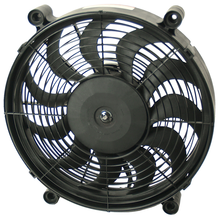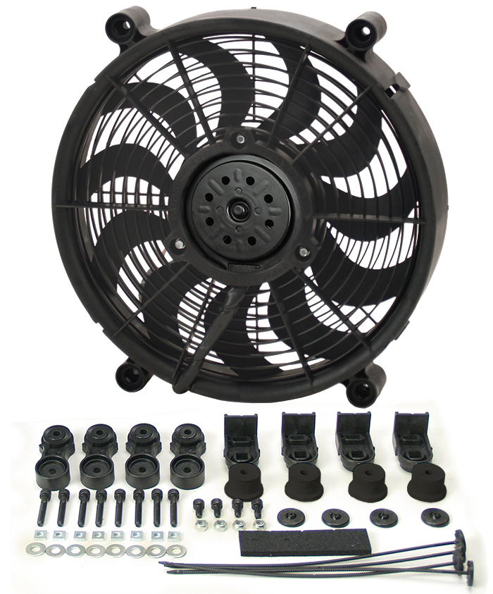 A very popular primary cooling fan, this 14" High Output Single RAD fan is a self-shrouded, symmetrical design with four molded mounting points. Motivated by a 2-speed 265 watt Bosch motor driving 11 patented skewed blades, Can be used as a pusher or puller fan by simply flipping brackets without changing direction of the unit. Moves up to 2100 CFM while drawing up to 22 amps. Includes a patented ratchet mounting system for a professional installation.