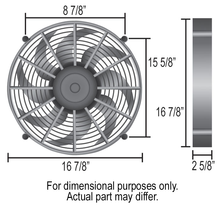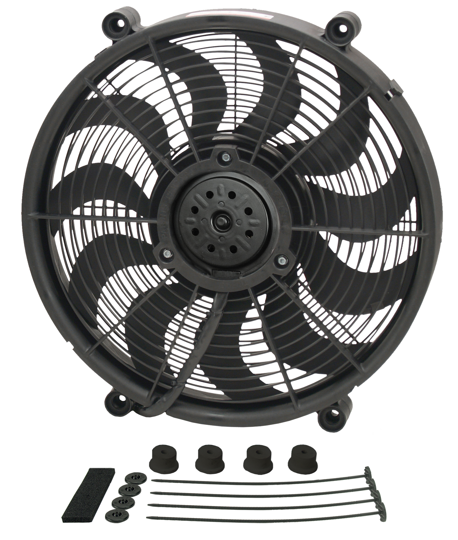 A very popular primary cooling fan, this 17" High Output Single RAD fan is a self-shrouded, symmetrical design with four molded mounting points. Motivated by a 2-speed 265 watt Bosch motor driving 11 patented skewed blades, it can be used as a pusher or puller fan without changing direction of the unit. Moves up to 2400 CFM while drawing up to 23.5 amps.