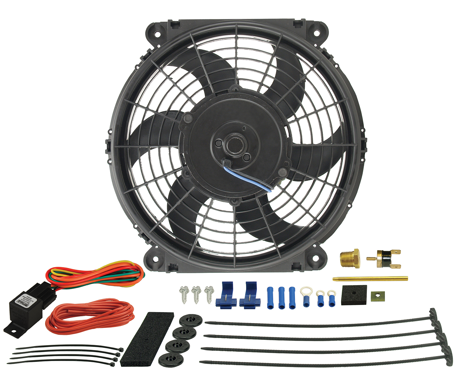 One of our most popular models, this 10" reversible Tornado fan uses 6 skewed blades, producing 650 CFM at 0 static pressure while drawing only 5.3 amps. Kit includes a high quality single stage fan controller with preset 180°F-on and 165°F-off temperature controls and includes both a push-in radiator probe and a 3/8" NPT brass water jacket probe, plus all necessary installation hardware. Made in the USA.