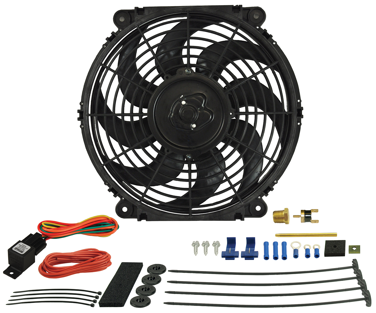 This 12" reversible Tornado fan uses 8 skewed blades, producing 880 CFM at 0 static pressure, drawing only 8.8 amps. Take two of these fans and one of our 16701 Dual fan mounting brackets and you have a powerful dual fan combo in a compact package. Kit includes a high quality single stage fan controller with preset 180°F-on and 165°F-off temperature controls and includes both a push-in radiator probe and a 3/8" NPT brass water jacket probe, plus all necessary installation hardware. Made in the USA.