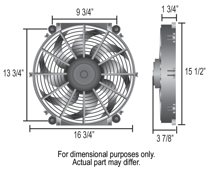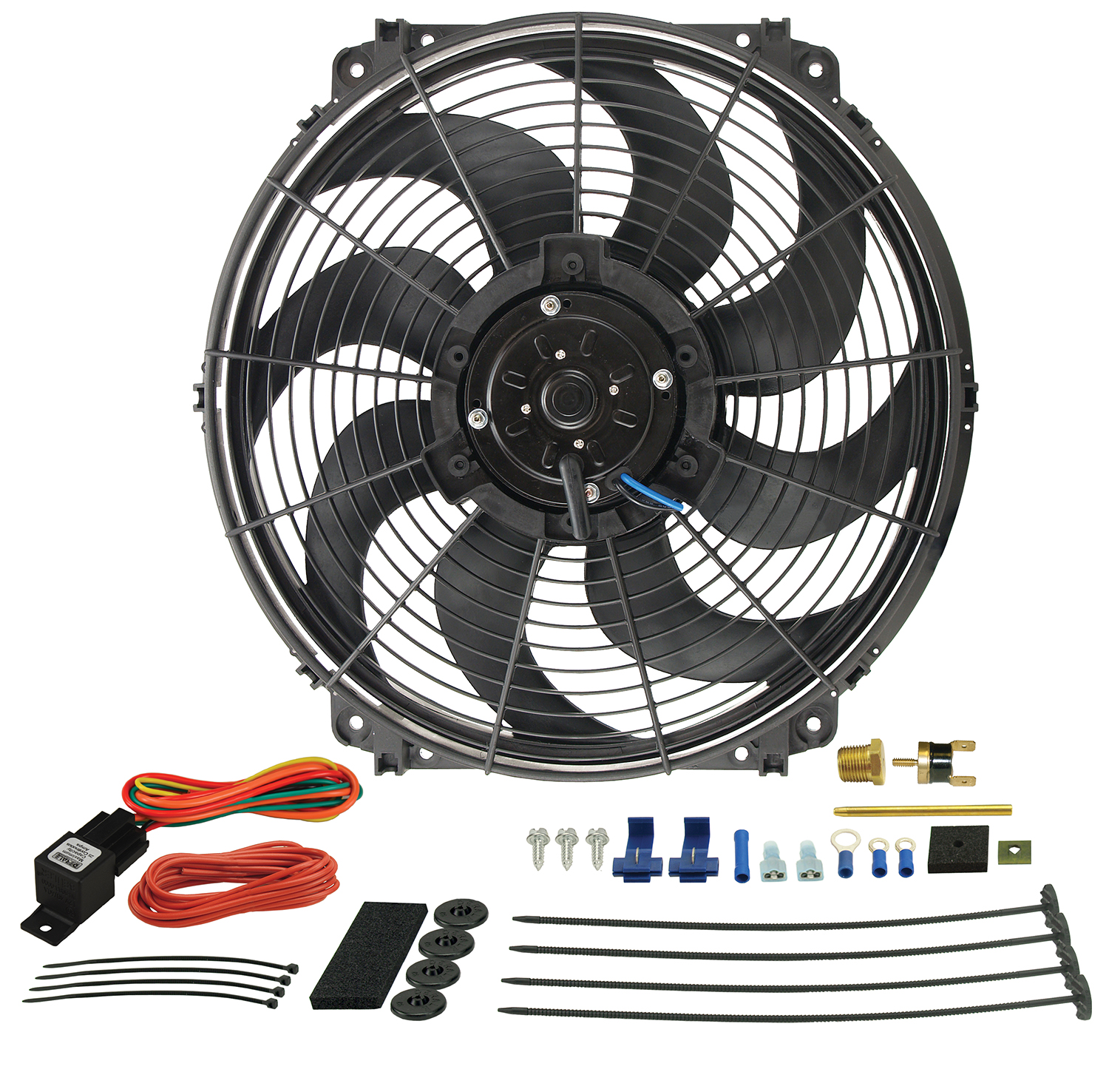 Our top of the line 16" reversible Tornado fan uses 8 skewed blades, producing a healthy 2175 CFM at 0 static pressure, drawing only 18.4 amps. Kit includes a high quality single stage fan controller with preset 180°F-on and 165°F-off temperature controls and includes both a push-in radiator probe and a 3/8" NPT brass water jacket probe, plus all necessary installation hardware. Made in the USA.