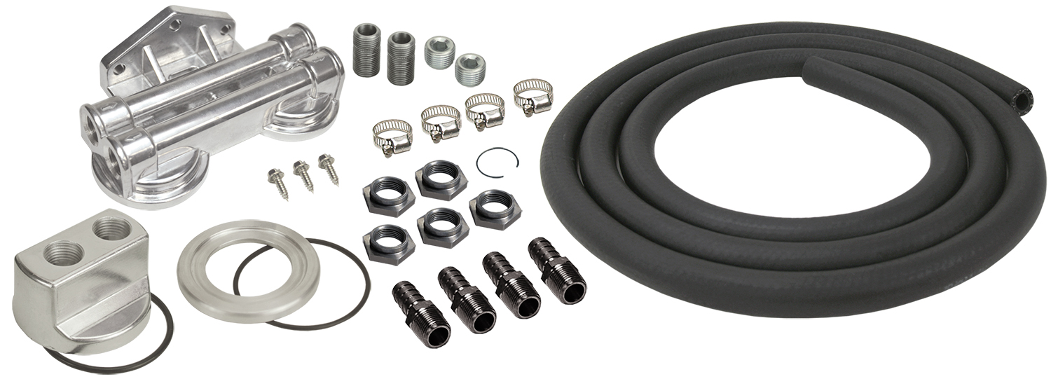 This Universal dual filter kit allows oil filters to be relocated to a convenient, easy-access location. Includes a high quality, die cast aluminum 1/2" NPT ports up filter mount and a 1/2" NPT ports spin-on adapter with most everything you need for an easy installation. Filter mount uses Fram PH8A Oil Filter or equivalent, using a 3/4-16 filter thread. Designed to fit most passenger vehicles on the road today with 2 1/2" to 3 1/2" oil filter landings. Spin-on adapters provide external oil lines to allow the addition of an engine oil cooler and/or remote filter mount, installing at the stock engine oil filter location. This all-new version has a billet style look and has an ultra-bright, polished appearance.
