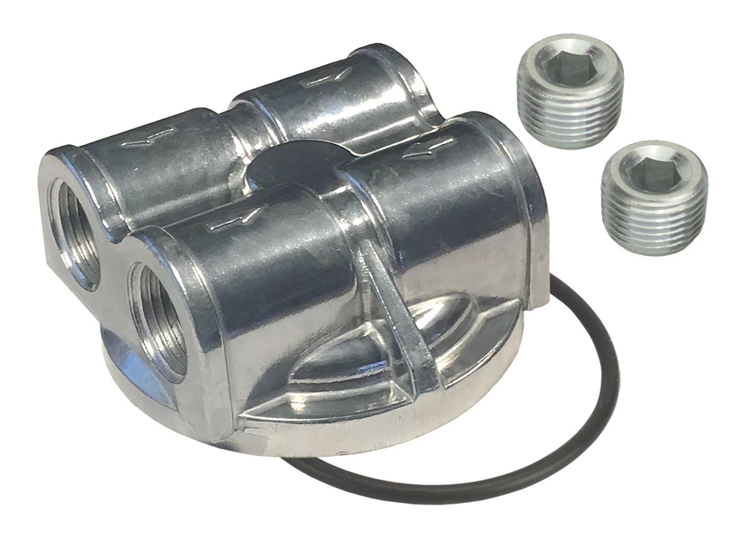 High quality die-cast aluminum spin-on adapter with 1/2" NPT dual side ports, 13/16-16" threads and fits 2 1/2" and 2 3/4" oil filter landings. This adapter provides external oil lines to allow the addition of an engine oil cooler and/or remote filter mount, installing at the stock engine oil filter location. Comes in bright finish.