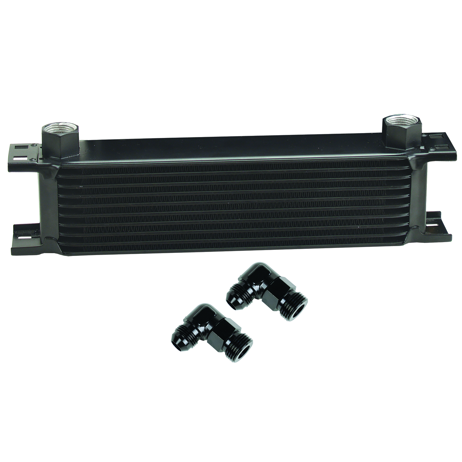 Our most efficient heat exchanger, the all aluminum 10 row Stacked Plate cooler features sturdy furnace brazed construction, full 2" deep turbulator-equipped plates and a black powder coat finish. With minimal pressure drop it can be used for engine, transmission or fuel cooling. Includes aluminum 90° x -10AN male adapter fittings.