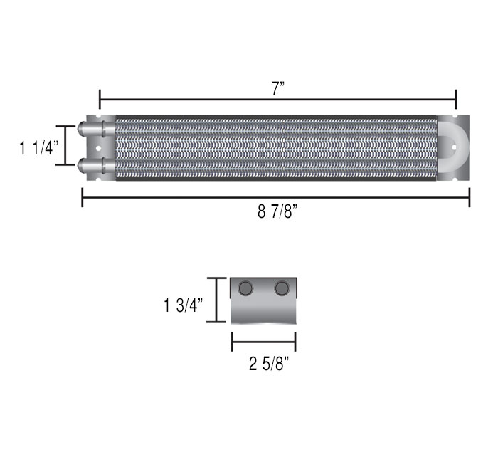 This small 2 pass fluid copper/aluminum cooler features -6AN fittings, extruded plastic fin edge guards and a black powdercoat finish for long lasting durability. It also includes mounting brackets at each end and is ideal for fuel or power steering cooling as well as auxiliary transmission cooling.