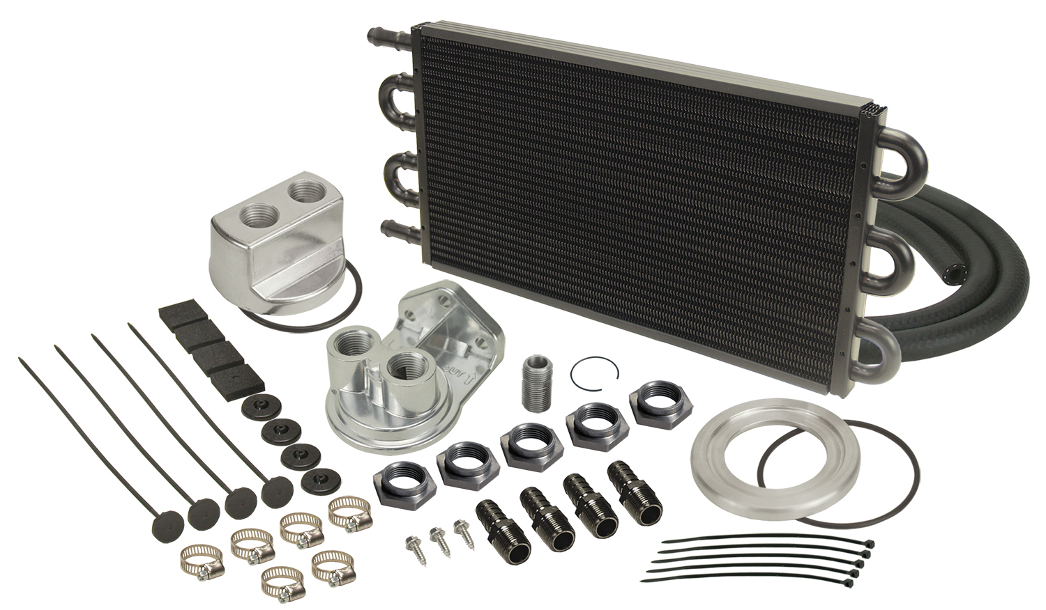 This kit not only includes an engine oil cooler but a remote oil filter mount. This Tube & Fin oil cooler kit reduces oil temperatures to help extend the life of lower end components and oil life. It can also help to reduce coolant temperatures. This universal kit comes with a complete installation kit to install easily on most vehicle engines. Filter mount uses Fram PH8A Oil Filter or equivalent.