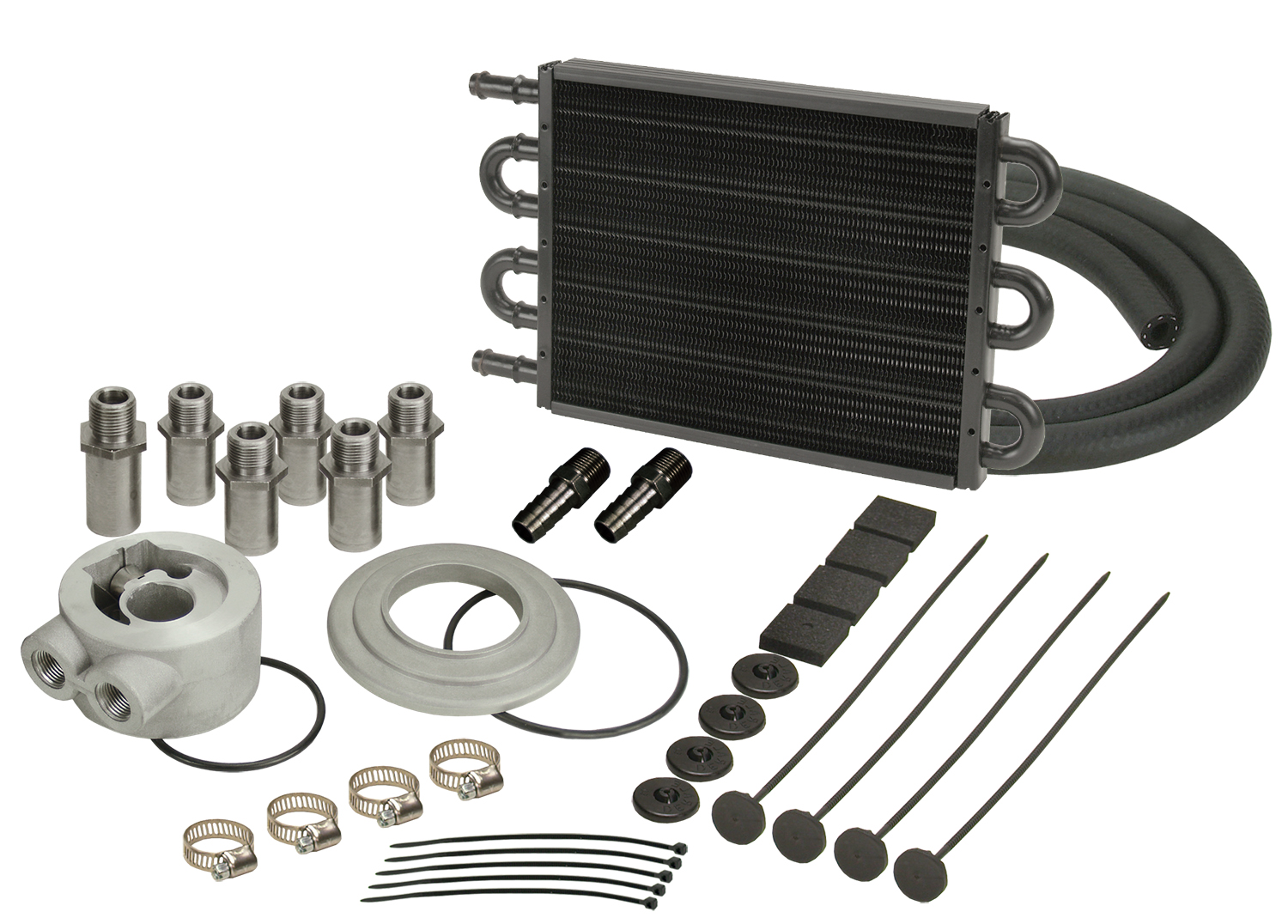 Featuring an efficient, high capacity 6-Pass copper/aluminum Tube and Fin cooler, this Made-in-the-USA unit is perfect for stock to mild street use and will also reduce coolant temperatures as well as oil temperatures. The kit includes a sandwich adapter and several sleeve nut sizes to accommodate a variety of engine combinations.