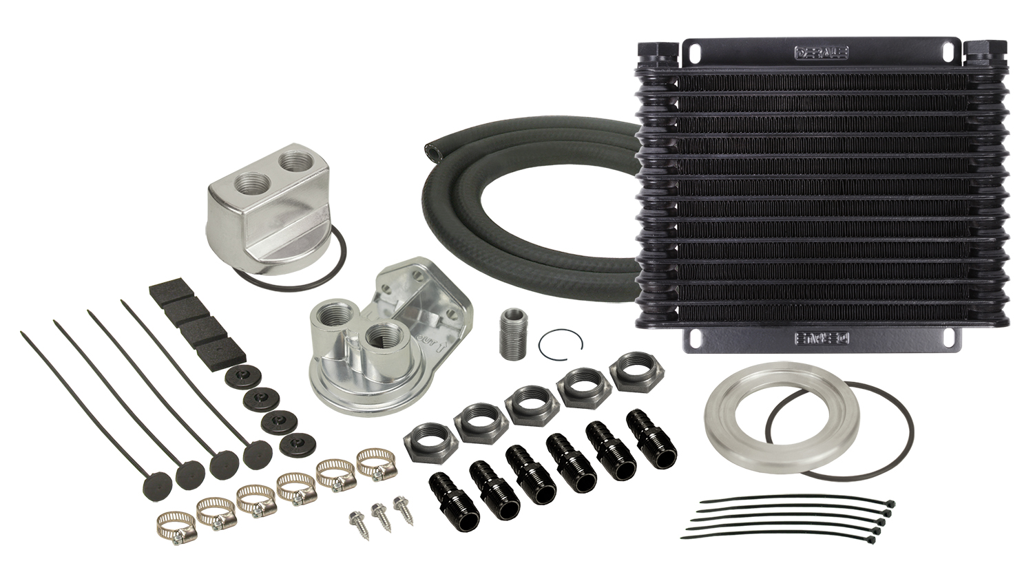 This kit not only includes an engine oil cooler but a remote oil filter mount. This aluminum plate and fin-based oil cooler kit reduces oil temperatures to help extend the life of lower end components and oil life. It can also help to reduce coolant temperatures. This universal kit comes with a complete installation kit to install easily on most vehicle engines. Filter mount uses Fram PH8A Oil Filter or equivalent.