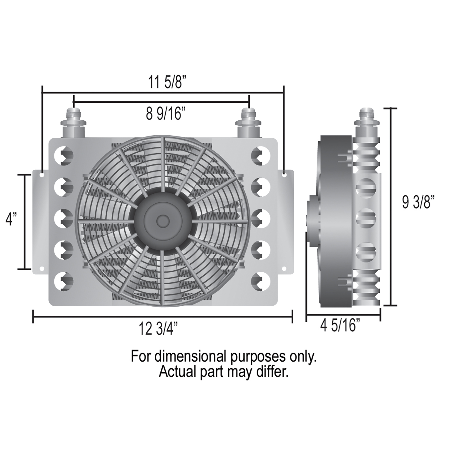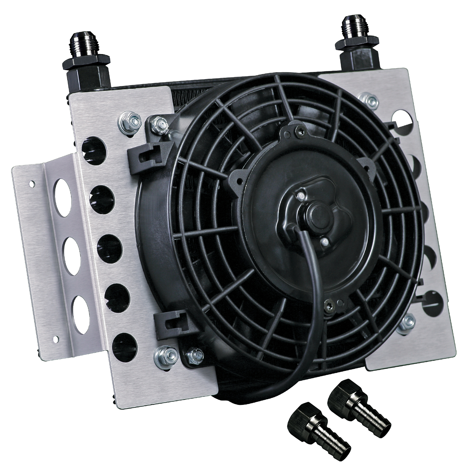 - Cooler assembly includes fan mounted cooler, two -8AN fittings and two -8AN x 1/2" hose barb fittings