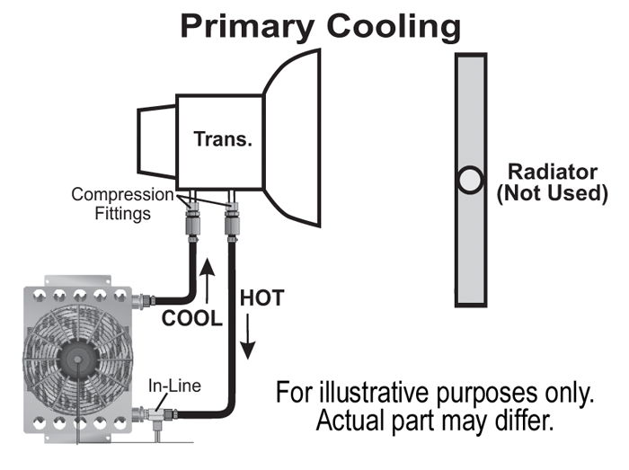 - Transmission cooler kit includes fan mounted cooler, two -8AN fittings hose barb fittings, 180°F In-line thermostat, 10 ft. of OEM spec hose, two 1/2" compression fittings, and mounting hardware