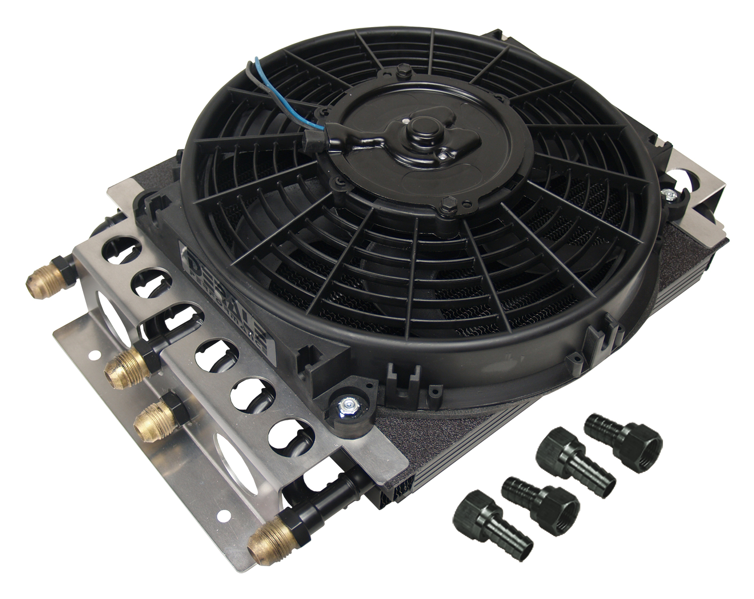Combining an efficient 8 & 8 Pass copper/aluminum Made-in-the-USA cooler with a powerful 10" Tornado electric fan, this compact remote cooler cools two separate systems with one compact design that can be mounted literally anywhere space permits. Includes clear anodized aluminum mounting brackets, (2) -8AN x 3/8" and (2) -8AN x 1/2" hose barb fittings to adapt to a wide variety of heat removal requirements.