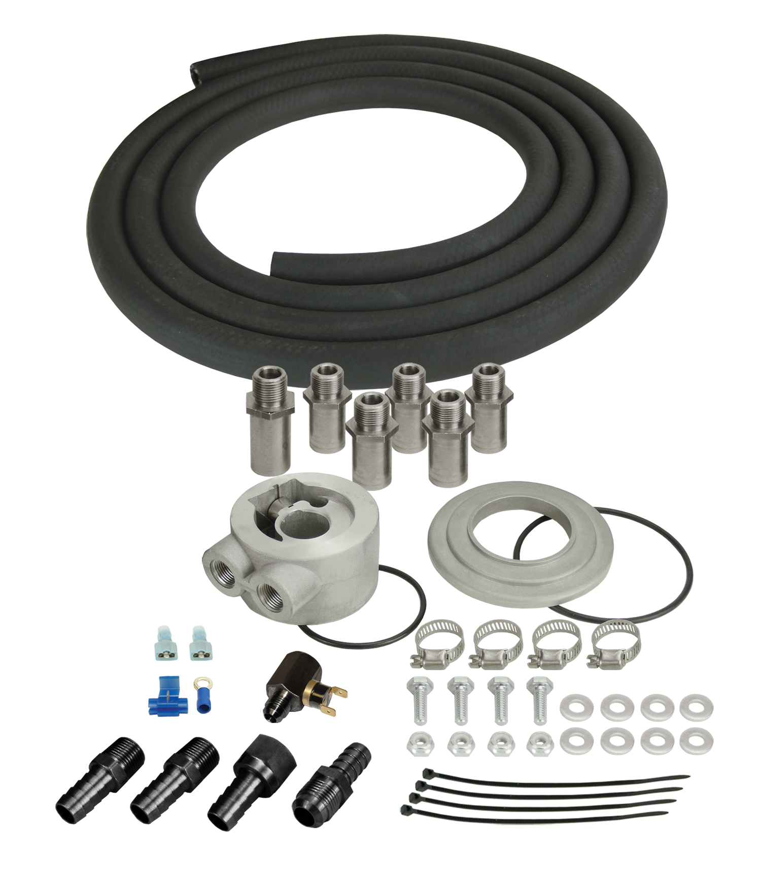 - Engine Oil Cooler kit includes universal* thermostatic sandwich adapter and adapter plate, 13/16-16", 3/4-16", 18mm, 20mm, & 22mm sleeve nuts, 180°F In-line thermostat, 10 ft of 1/2" OEM spec hose, and mounting hardware