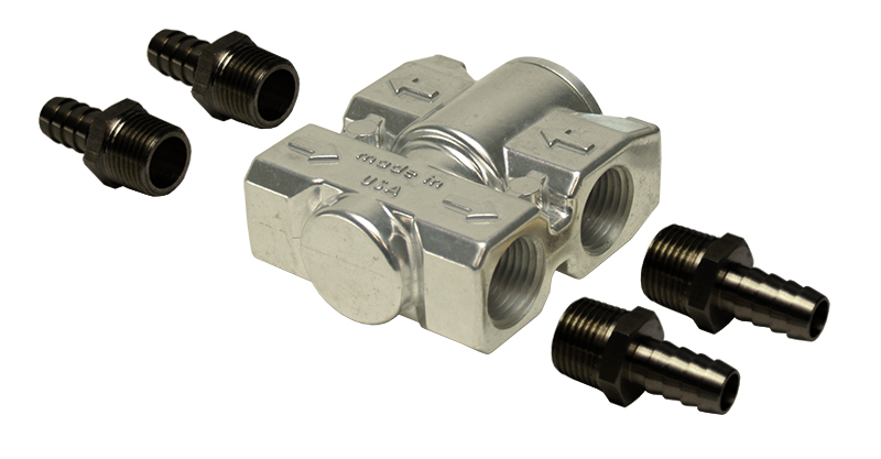 This Billet Style Cast Aluminum Fluid Control Thermostat with 1/2" NPT ports allows the oil to bypass the cooler until it reaches 180°F at which point the internal thermostatic valve will close and force 100% of the oil through the cooler while maintaining a constant pressure system. This process allows the engine/transmission to achieve the ideal operating temperature quicker before passing the oil through the cooler. The unit can be rotated 180 degrees to change flow direction. Hardware kit with hose barb fittings and hose clamps included.