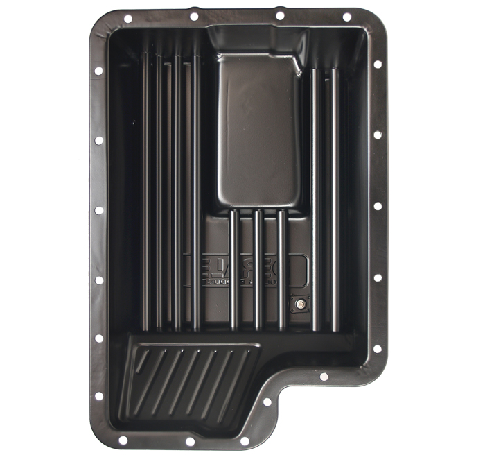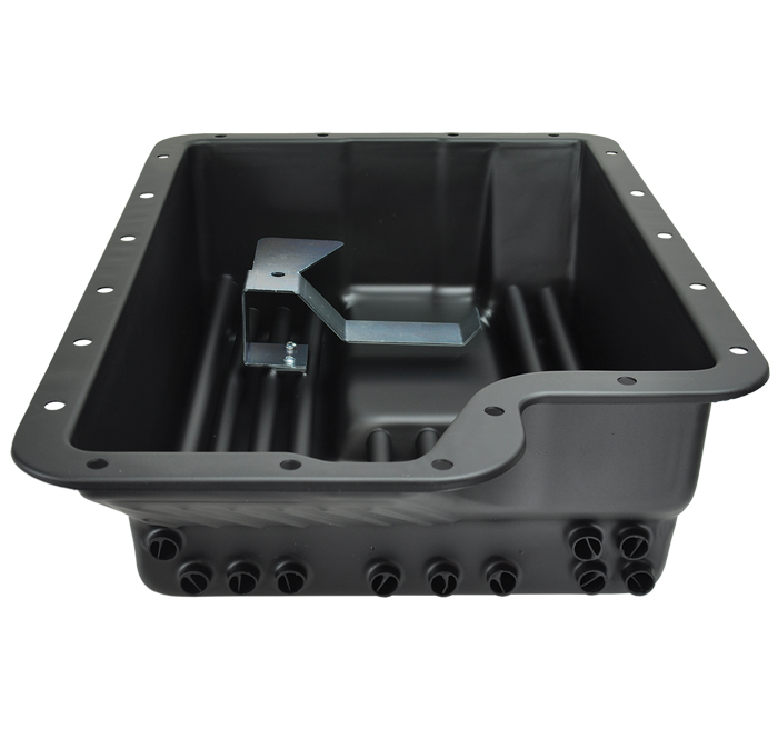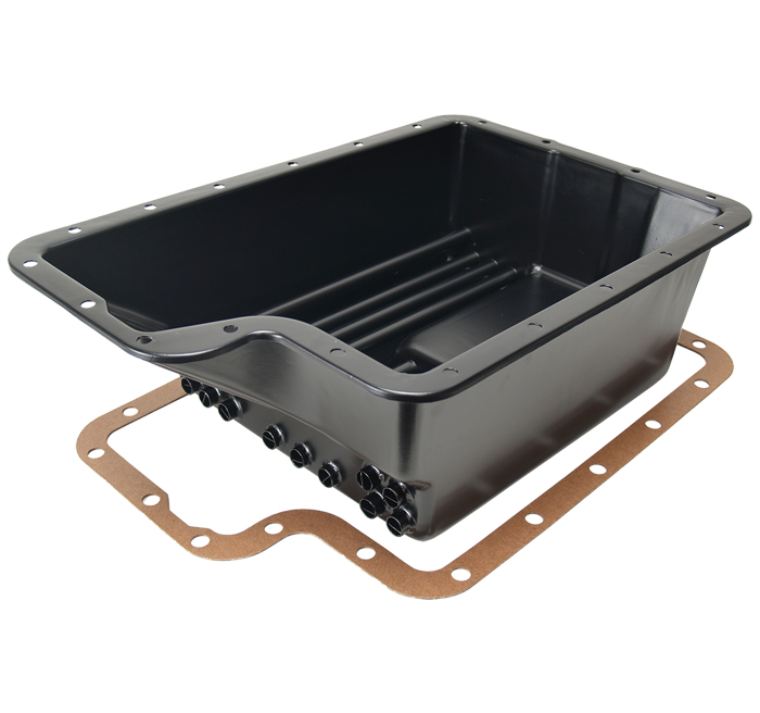 Derale's Transmission Cooling Pan #14208 uses air passing beneath the vehicle and redirects it to help lower transmission oil temperatures. Designed for Ford's E4OD, 4R100 and later 5R110 & 5R110W heavy duty transmissions, this pan features brazed, turbulator-equipped airway tubes passing through the lower section of the transmission pan for more efficient cooling, each is individually pressure tested to ensure a leak-free pan. We've included a much stronger magnetic drain plug and rubber/steel reusable washer, in addition to a 1/8" NPT temperature sender bung located in the side of the pan. Finished with a durable black two-stage coating, each pan also includes neoprene gasket and 1/8" NPT temperature sender plug.
